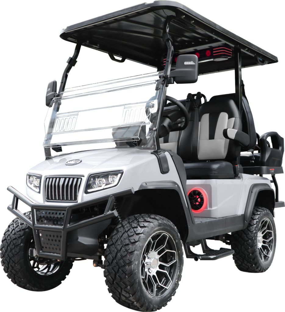 In Stock! Luxury two – toned upholstery – Black & Light Grey Navy body 48V Lithium battery 48V 6.3KW AC motor 400 Amp Evolution AC controller 25A Evolution on-board charger Luxury Steering Wheel USB Charging Ports Aluminum Cargo Box (Tiltable, with air shocks ) Cargo box: 43″x 65″ x 11″