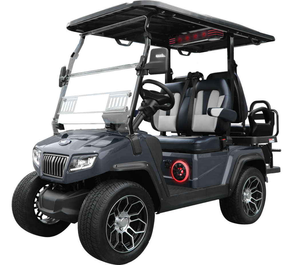 Arriving in January! Fully loaded Artic Grey body Ocean Wave Blue Seats 160 AH Lithium Battery Four Wheel Drive with dual AC motors: 4 & 6.3kw Electric Power Steering Multifunctional dash with: 10.1″ – inch display: reverse camera and Bluetooth with color changing soundbar, 4 body-mounted speakers & 4 roof mounted speaker sound system Built