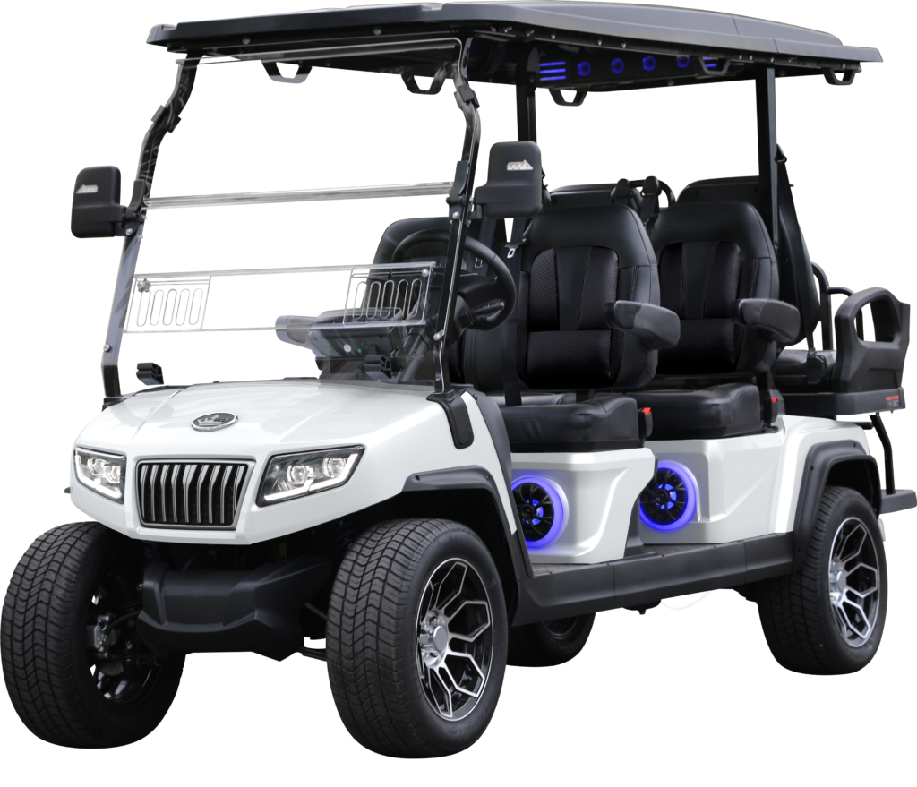 Arriving in January Fully loaded Mineral White body Luxury upholstery (Black) 160 AH Battery Motor: 6.3kw 9 – inch display: reverse camera and Bluetooth with color changing soundbar & 4 speaker sound system Luxury seats with foldable armrests Rear – facing flip – flop seat with storage compartment 14×7” Aluminum Wheel/225/55r14’’ Radial Tire
