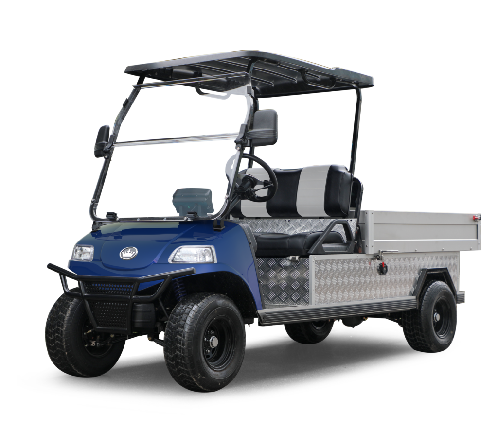In Stock! Luxury two – toned upholstery – Black & Light Grey Navy body 48V Lithium battery 48V 6.3KW AC motor 400 Amp Evolution AC controller 25A Evolution on-board charger Luxury Steering Wheel USB Charging Ports Aluminum Cargo Box (Tiltable, with air shocks ) Cargo box: 43″x 65″ x 11″